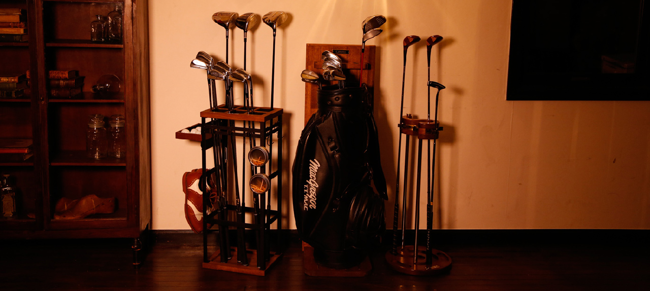愛用中のゴルフバッグ、手放せないバッグの置き場として。マーカーやボールなどの小物類とともに室内床を汚さず美しくバッグ保管できるスタンド。 背板にシャフト固定用ラバーホルダーが3個付属。ゴルフバッグを置かない時にはパタースタンドとして使用できる設計。底板には真鍮製モールを埋め込むことで木材の傷つきを防止し、風通しのよい構造。